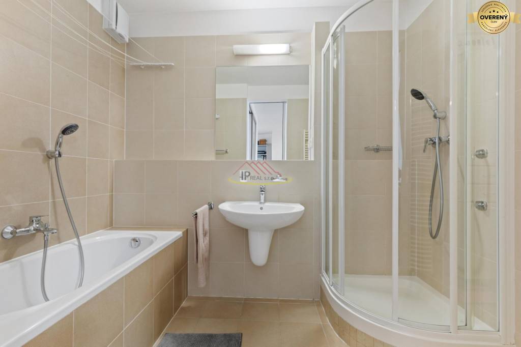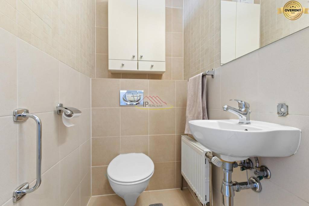V kúpeľni je sprchovací kút , vaňa a bidet. WC je samostatné. Obklady sú v neutrálnych zemitých farbách. Celý interiér je vkusný a starostlivo udržiavaný.