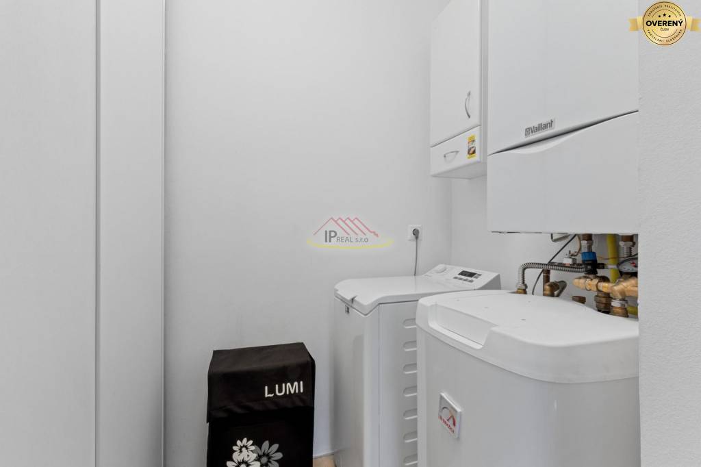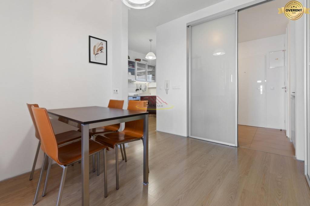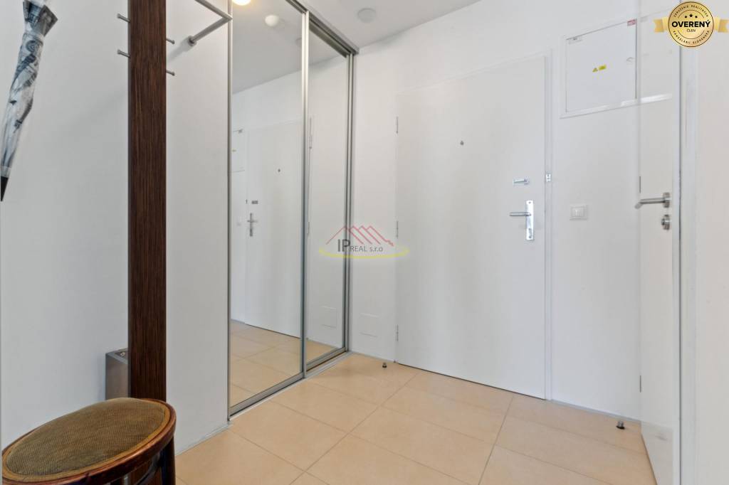 Byt je dobre riešený s modernou a funkčnou dispozíciou. Vstupuje sa do predsiene, ktorá je vybavená šatníkovou skriňou, odkiaľ sa vchádza do priestrannej obývačky s jedálenským kútom, prepojeným s kuchyňou. Pri kuchyni je menší sklad slúžiaci ako špajza a technická miestnosť, nakoľko je tu umiestnený plynový kotol Vaillant na vykurovanie a tiež práčka. Obývačka je priechodná do spálne, kde okrem postele je opäť vstavaná skriňa s množstvom úložného priestoru. Z oboch izieb je východ na loggiu so sedením.